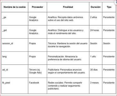 A continuación, se presenta una tabla detallada con las cookies específicas que utiliza este sitio web, incluyendo su nombre, proveedor, finalidad, duración y tipo: