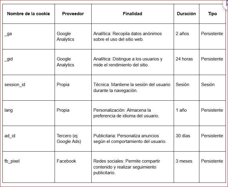 Nota: La lista anterior es un ejemplo representativo. La relación exacta de cookies puede variar según las funcionalidades implementadas en el sitio web. Los usuarios pueden consultar la lista actualizada de cookies en cualquier momento a través del panel de configuración de cookies.